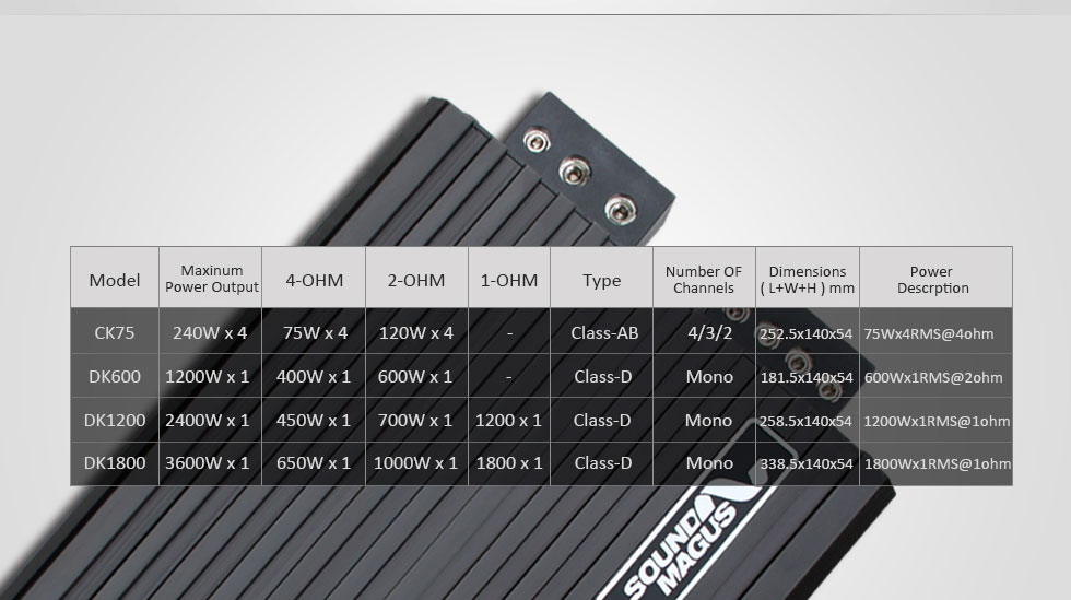 Mono Amplifikatör 1Ohm Load NA 2Ohm Load 600W 4Ohm Load 400W Output circuitry:Class D Output power(RMS,?1% THD + N@0.5 ohms):NA Output power(RMS,?1% THD + N@1 ohms):NA Output power(RMS,?1% THD + N@2 ohms):600W Output power(RMS,?1% THD + N@4 ohms):400W Signal-to-noise (@ 1W):>80dB Maximum power:600W Signal Inputs:RCA Signal Outputs:NA Auxiliary outputs:NA Distortion (SMPTE-IM):NA Damping Factor:- Input Impedance:- Amplifier Protection:YES Idle current:- Input Sensitivity :0.2V-5V DSP input stage:NO Dimensions (L x W x H):184x140x54mm Weight(KG):-